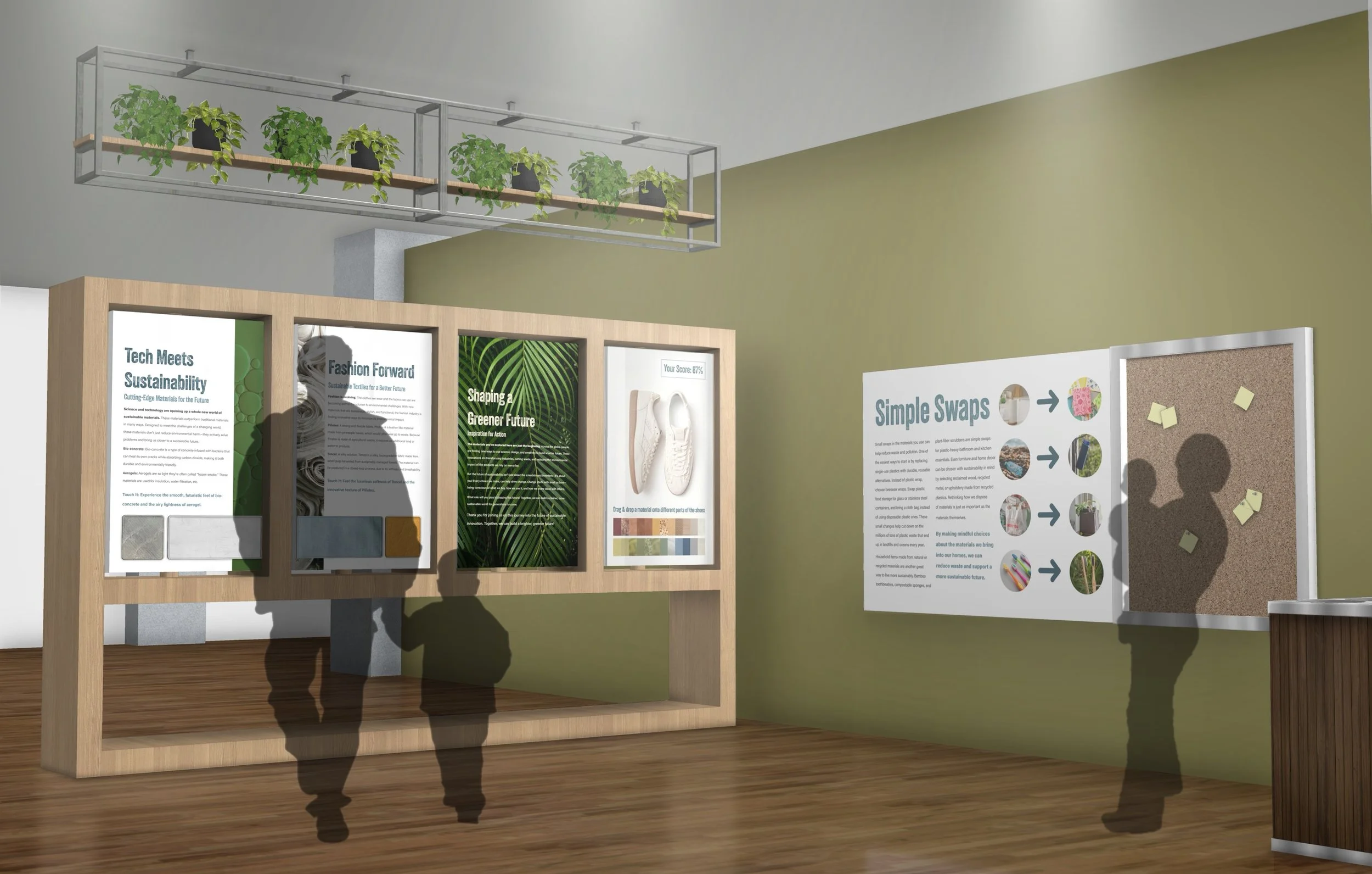 This project represents a collaborative effort to create a museum gallery that explores the intersection of design and sustainability in an engaging, interactive way. The gallery showcases transformative approaches to plastic recycling, the creative potential of upcycling and textile recycling and the process of converting glass into sand. Additionally, the exhibit delves into the world of emerging sustainable materials, shedding light on their role in shaping the future of design. The space not only educates visitors on the importance of sustainable practices but also inspires action, offering a glimpse into the future of eco-conscious design and the power of reimagining waste.