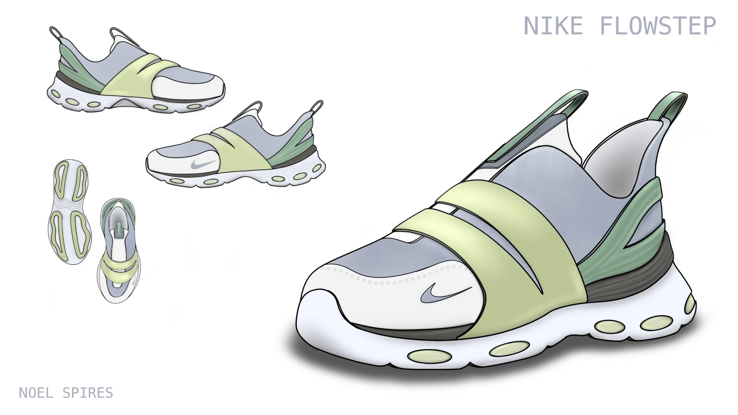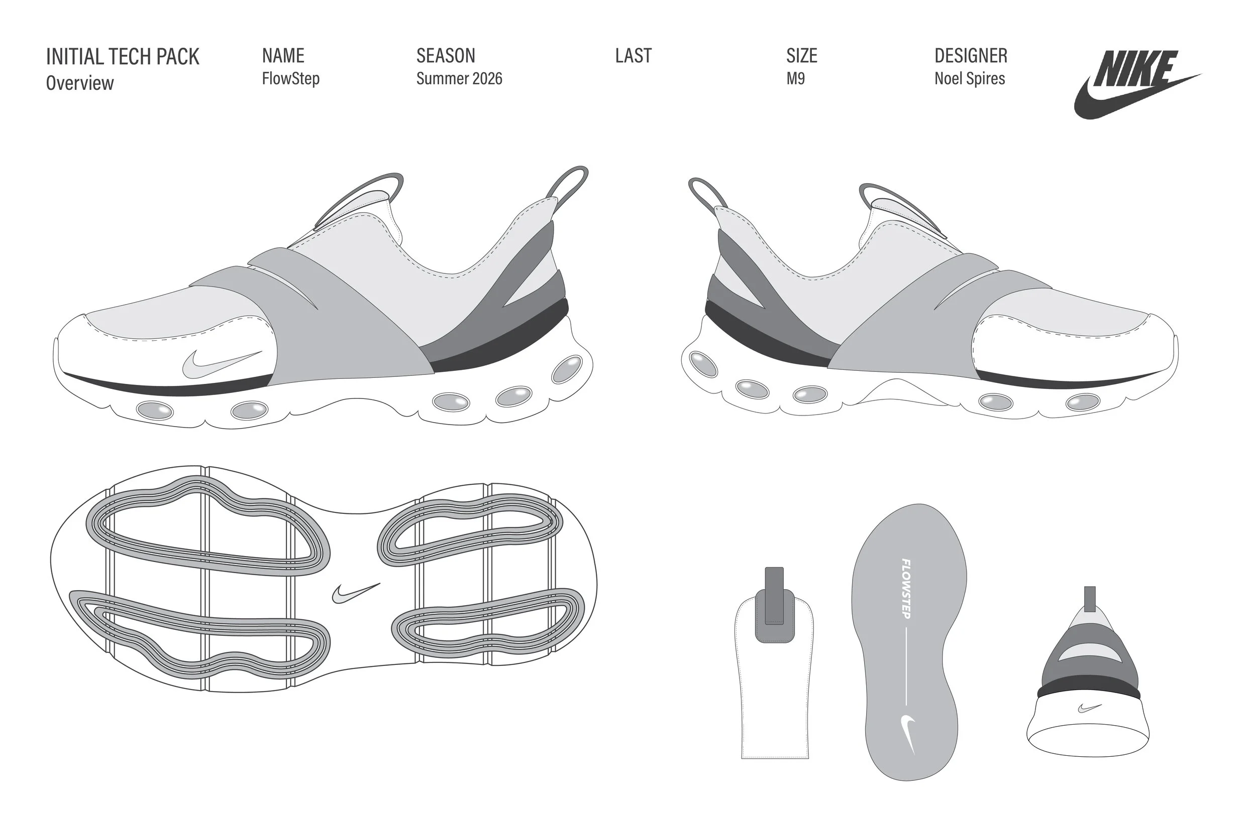 The Nike FlowStep is a footwear design project created to bring comfort, style, and ease to individuals living with arthritis. This concept blends a sleek, modern aesthetic with functional features like a reinforced heel counter, spacious toe box, and a hassle-free slip-on design. The project deliverables included a detailed design brief, a color/material/finish (CMF) rendering, and a tech pack developed in Adobe Illustrator. The FlowStep showcases how thoughtful design can empower movement without compromising style or support.