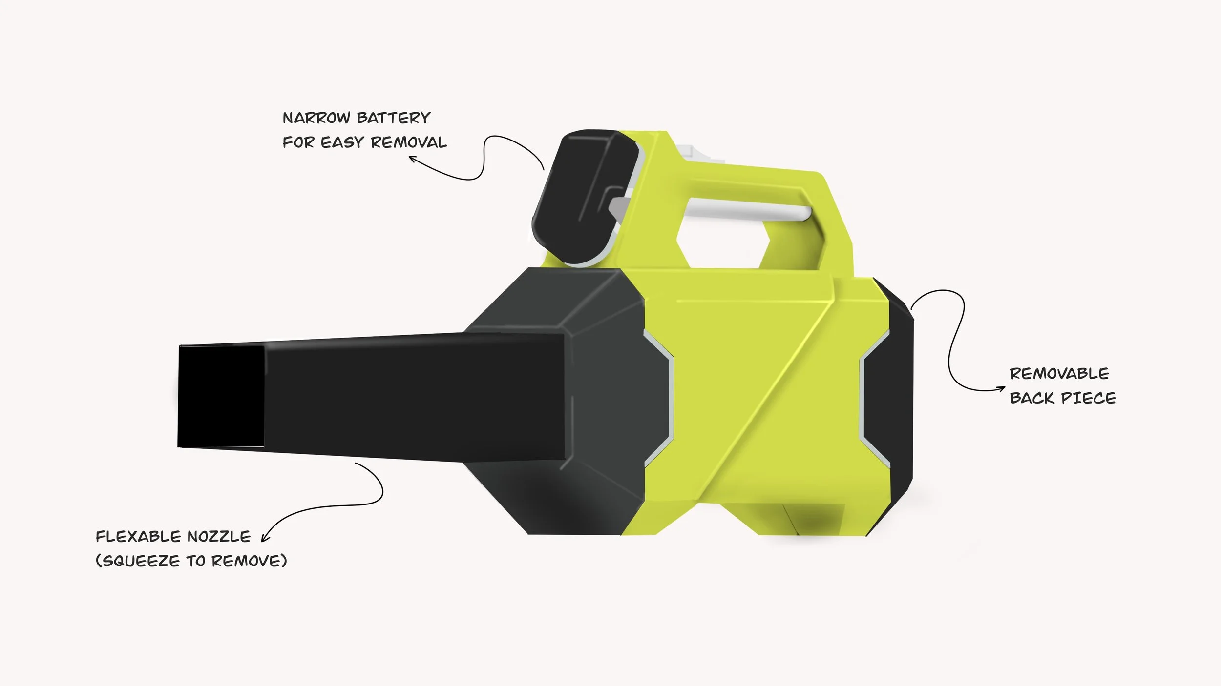 A sleek, user-friendly leaf blower for Ryobi’s One+ product line, built for comfort and convenience. Tailored for users with smaller hands, this concept features handles that provide a comfortable and secure grip. The intuitive disassembly system makes it effortless to put together and take apart, ensuring a hassle-free user experience every time. With its innovative quick-connect design, this leaf blower is perfect for those who want powerful performance without the complexity.